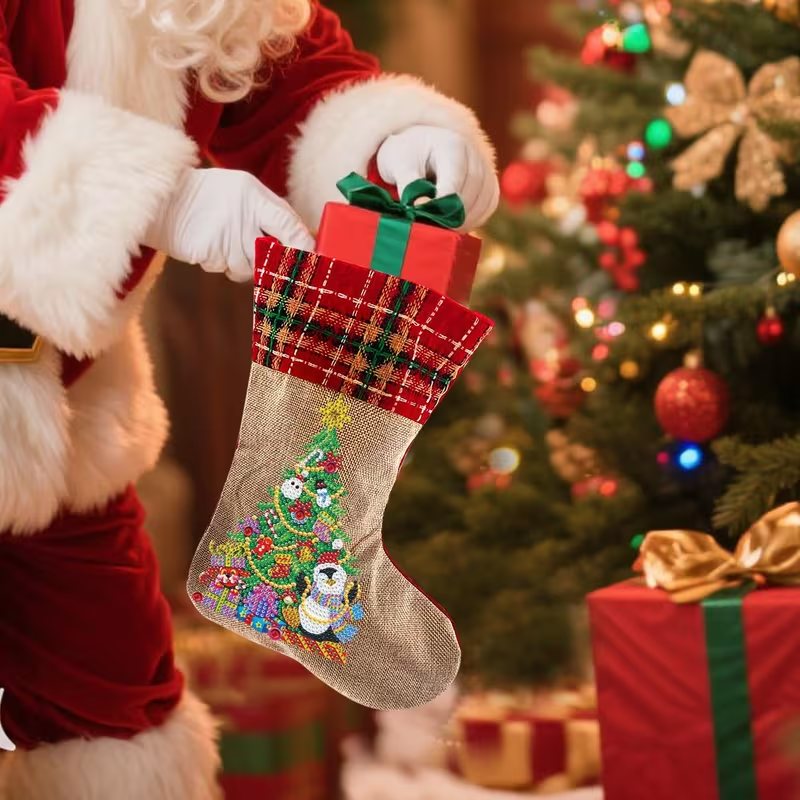 Bringen Sie Wärme, Atmosphäre und Kreativität in Ihr Zuhause mit unseren Diamond Painting Weihnachtssocken! Dieses wunderschöne Set besteht aus 2 Leinen-Weihnachtssocken mit festlichen Weihnachtsbaum-Motiven, die Sie ganz selbst mit funkelnden runden Steinchen verzieren können.