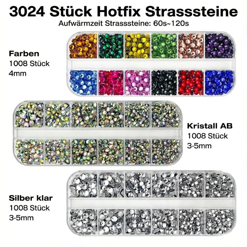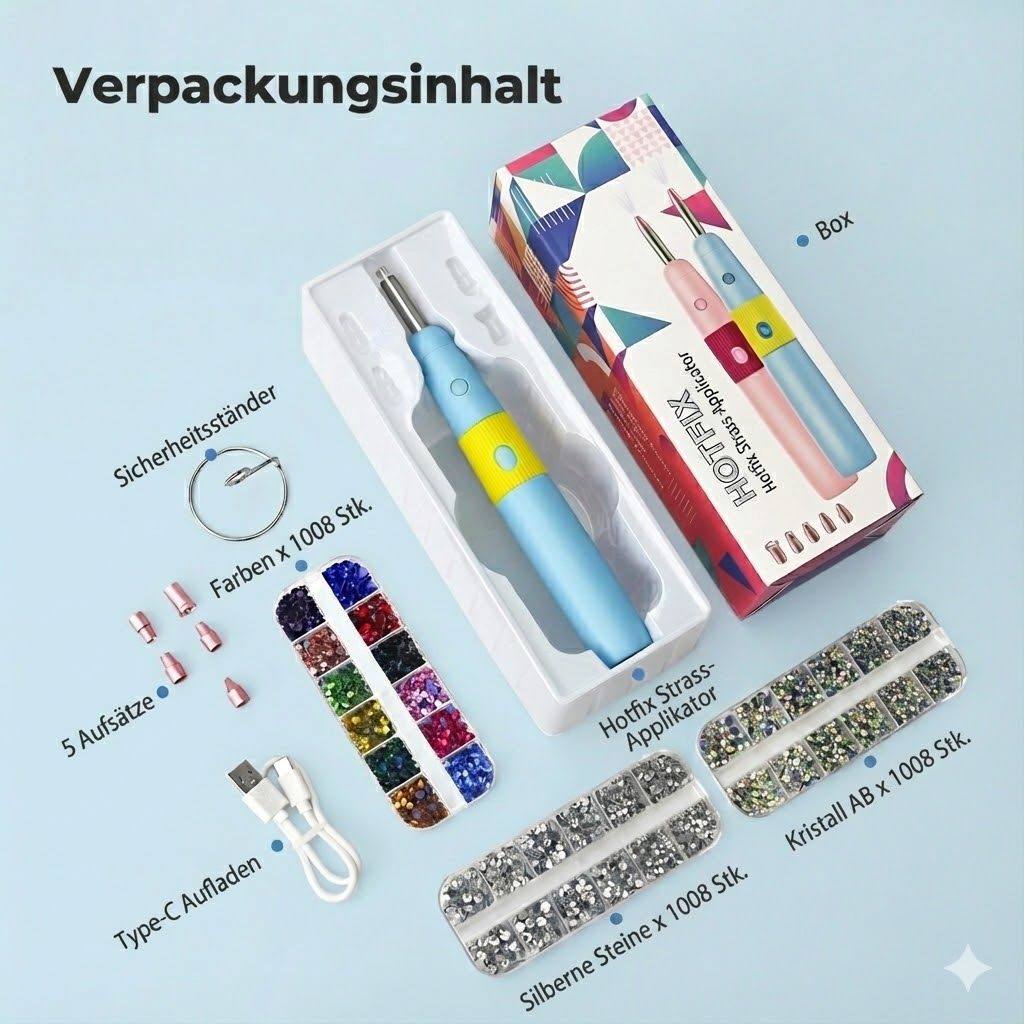 Produktinhalt: • Elektrischer Hotfix-Applikator-Stift • 5 austauschbare Aufsätze für verschiedene Größen von Strasssteinen • Sicherheitsständer zum sicheren Ablegen des Stifts • USB-Typ-C-Ladekabel • 1008 farbige Hotfix-Strasssteine mit 4 mm • 1008 Crystal-AB-Hotfix-Strasssteine mit 3–5 mm • 1008 silberfarbene Hotfix-Strasssteine mit 3–5 mm