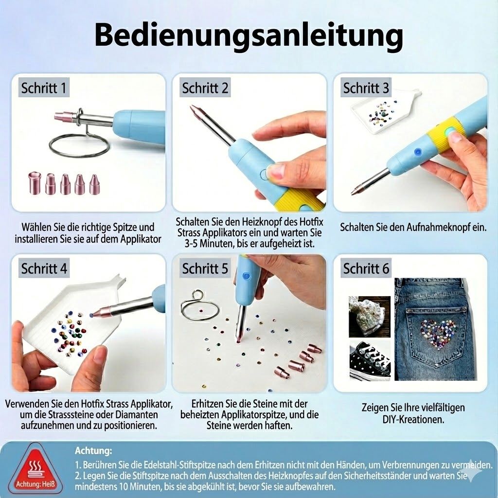 Entdecken Sie jetzt unseren elektrischen Hotfix-Applikator-Stift! Mit diesem Stift befestigen Sie Hotfix-Strasssteine ganz einfach auf Kleidung, Accessoires und DIY-Projekten. Der Stift arbeitet mit Wärme, wodurch die Klebeschicht auf der Unterseite der Strasssteine schmilzt und sich fest mit dem Material verbindet. Ideal zum Personalisieren von Kleidung, Taschen, Schuhen und kreativen Bastelprojekten.